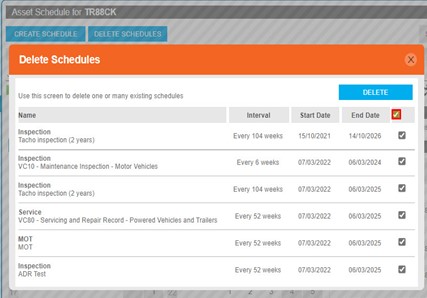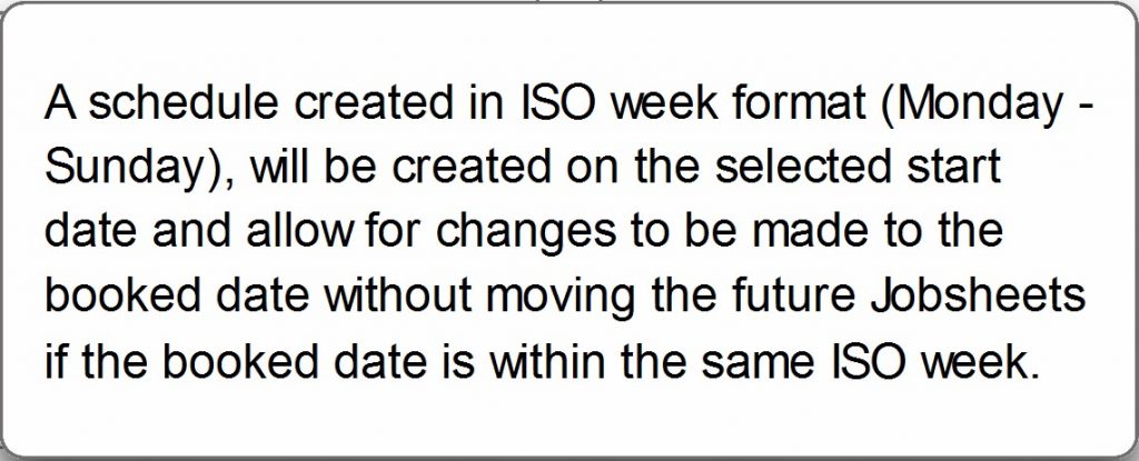 Once saved, a schedule cannot be amended, however, individual jobsheets can be moved or cancelled. Where an asset is going to miss a number of scheduled jobs it may be worth considering deleting the current schedule and re-creating it when the asset comes back on the road. No history is deleted.