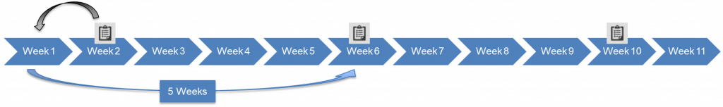 Cons of Example – If the SI planned for week 2 is carried out a week early, the resulting interval would have an additional week, in this case, 5 weeks instead of 4. To remain compliant an additional, ad hoc, SI would need to be generated, this increases the workload on admin staff managing the schedules and the technicians carrying out the work.
