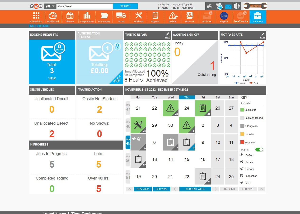 The Dashboard provides an overview of the status of jobs, booking requests, authorisation requests, your assets schedules, any defects that have been found on the assets, and various common KPI’s (Key Performance Indicators) including pre-use checks, fleet availability, and MOT pass rates.
