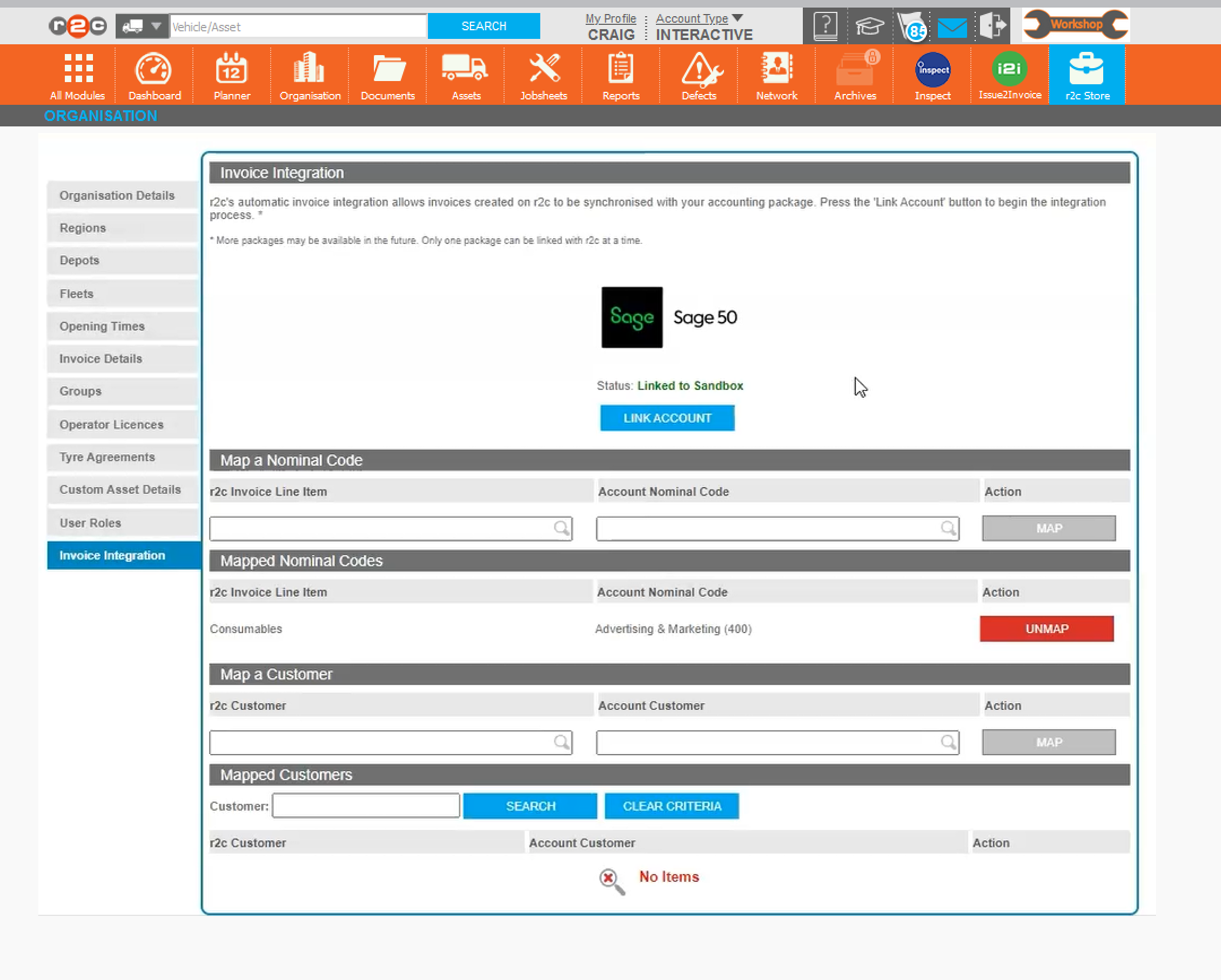 The invoice integration settings are only accessible by the finance administrator roles in the workshop or R&M provider accounts. Once configured these settings will only need to be updated when a nominal code changes or a new customer added. Note: If you do not have the finance administrator role, please get in touch with your account manager.