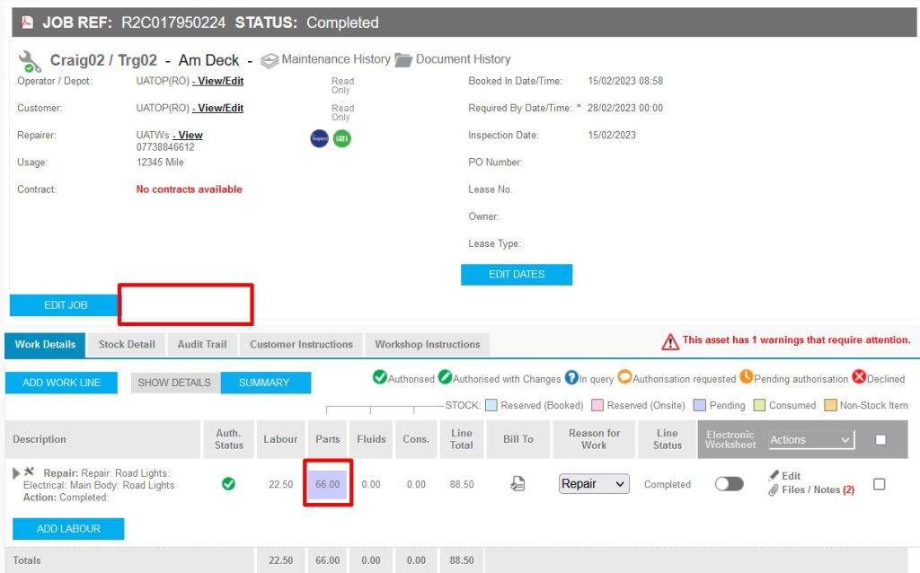 The jobsheet is displaying a purple row for the part not in stock, if the part has been placed on order it will now display a trolley icon.