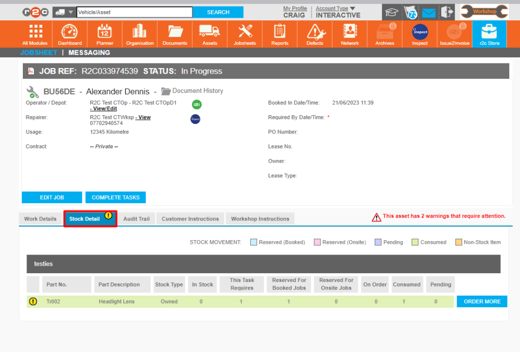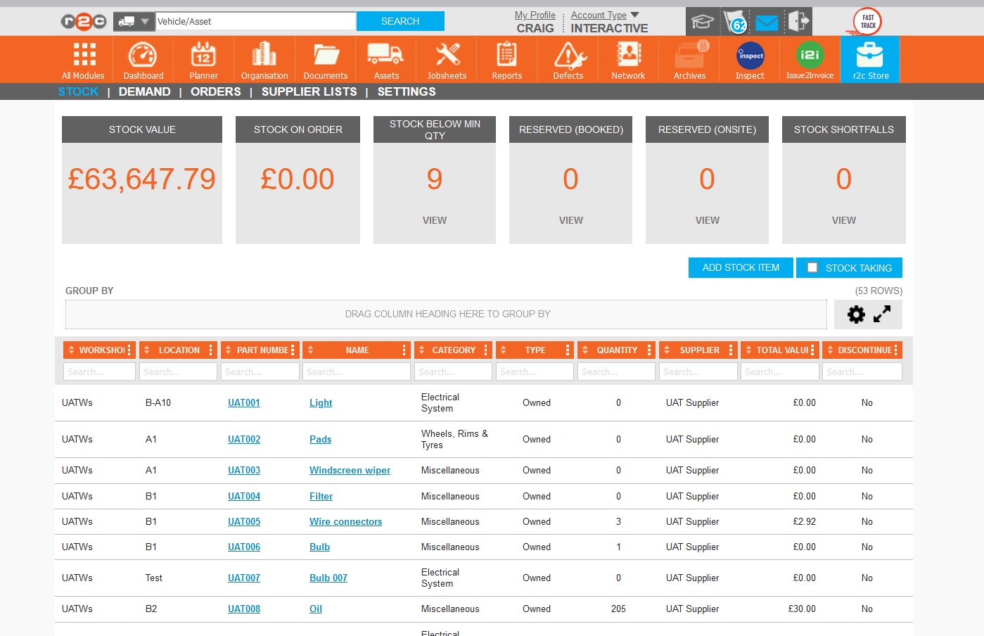 • Parts Manager: General management of the Stock module e.g. carrying out a stock take and creating new parts. This role is needed for access the demand page.