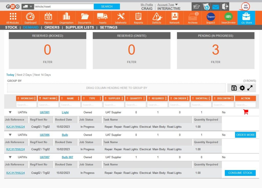 The demand page displays all parts required for in progress jobsheets, these will be in 1 of 3 statuses, 'on order', 'order more' or in stock waiting to be consumed.