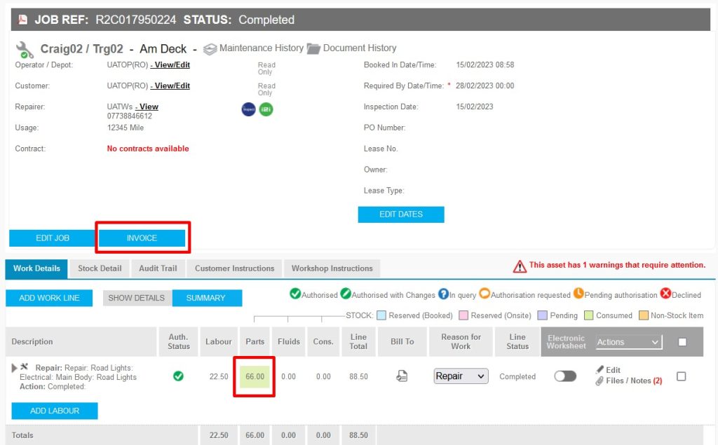 Any Pending parts on a jobsheet will prevent it from being invoiced, all stock parts should be consumed to the jobsheet in order to see the INVOICE button. See Parts Held in Demand for more details.