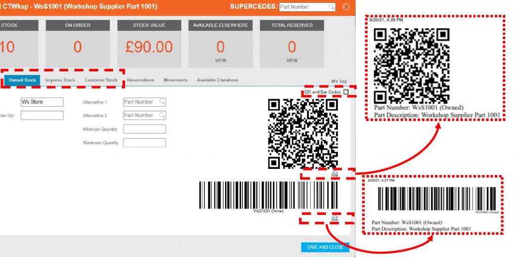 QR/Barcodes can be generated for ease of accounting, these can be pre-printed directly from the part’s record screen by selecting the ‘QR and Bar Codes’ link and then selecting the print button against the desired format. Where a large number of QR’s or Barcodes are required, a request can be made via r2c Customer Support.