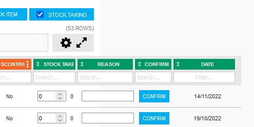 The Stock page can quickly be turned into a STOCK TAKING page. Four additional columns are added to the stock list to enable stock taking.