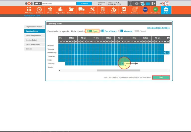 Opening Times – Set the opening times for your workshop by choosing an option from the key and then clicking and dragging along the time blocks. These times will be reflected on the WSL screen when allocating work.